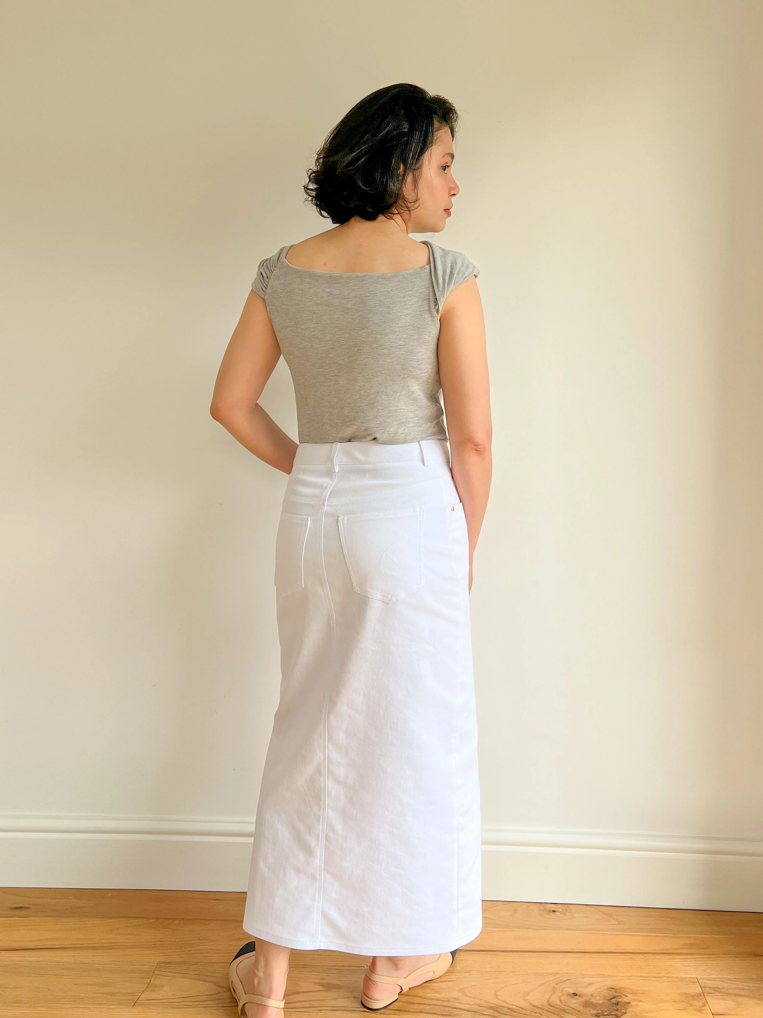 Suggested fabrics: Violet is designed for lightweight knit fabrics with four-way stretch, good recovery and drape. Fabrics like bamboo jersey, viscose jersey, and cotton jersey are recommended. The chosen material must contain elastane or lycra in its composition. Avoid low stretch materials and rib knits.