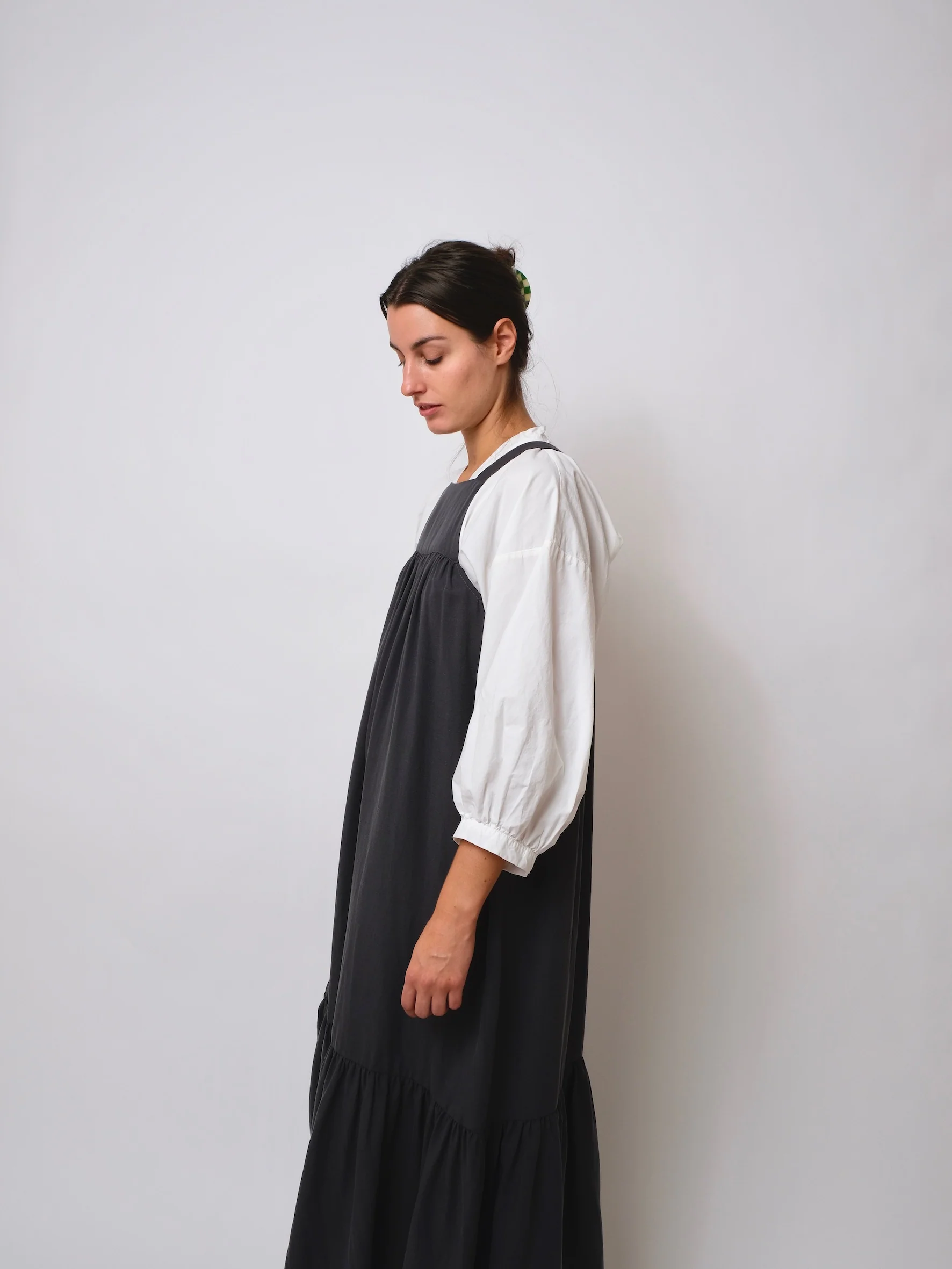 Buy the ZW Tier Dress sewing pattern from Birgitta Helmersson. This zero-waste dress pattern can be made four different ways: a short dress with thin straps, a long dress with thin straps, a short dress with sleeves, and a long dress with sleeves. Note if you are not using the sleeves, the straps will need to be cut from a contrast or remnant fabric.