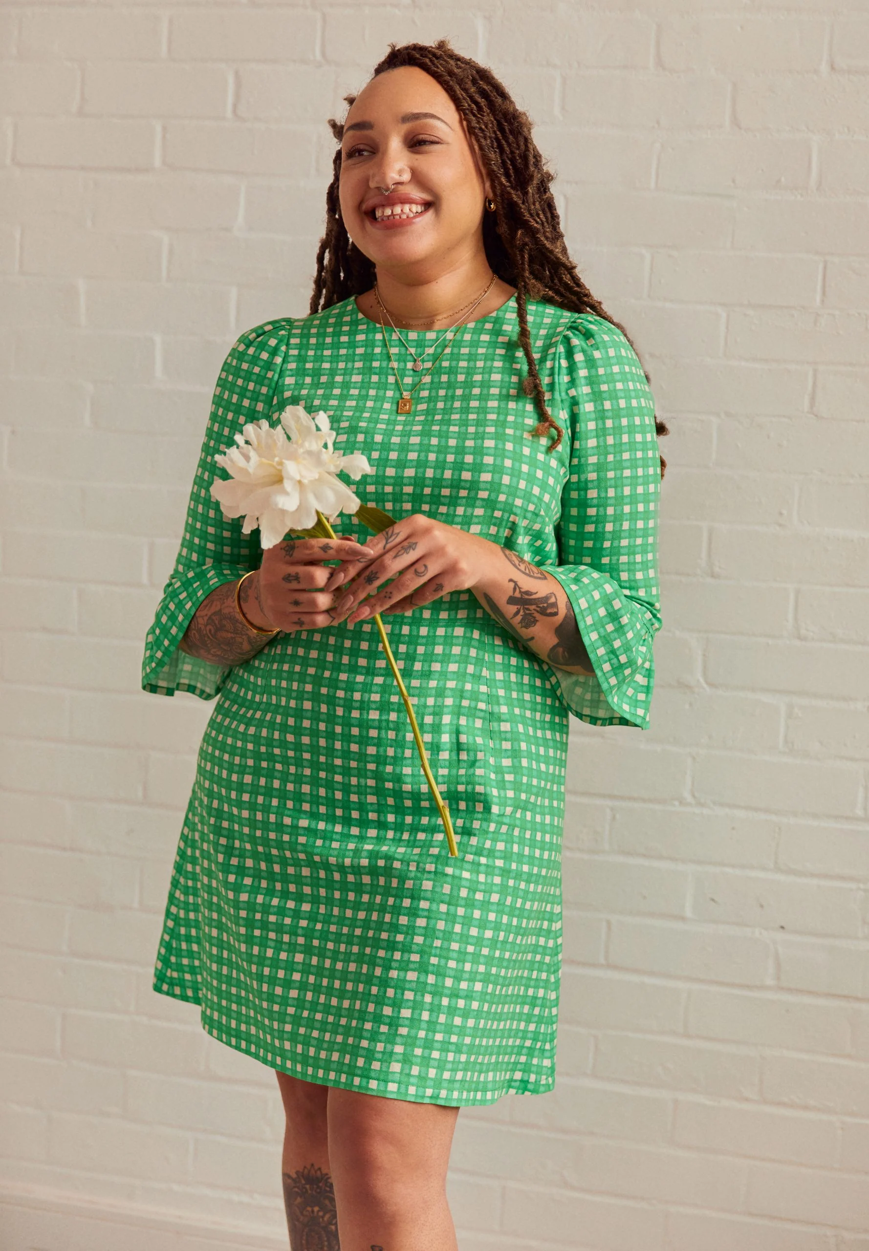 The waist seam sits about 1 cm above the natural waist, and the skirt gently skims over the hips. The Peony Dress is not designed to be closely fitted, but there are darts on the front and back of the bodice and skirt so you can easily adjust the fit to your liking. Both Views A and B have a sleeve frill. View A also has a skirt frill that falls just above the ankle, while View B finishes mid-thigh with no frill.