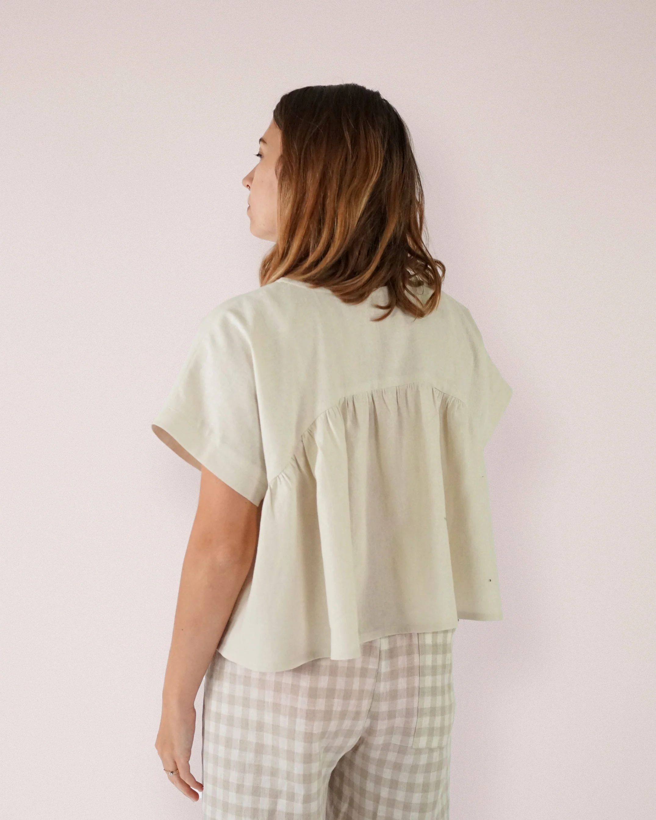 Buy the Wave Float Top sewing pattern from Matchy Matchy Sewing Club. The Wave Float Top is a fun and playful, easy to wear top designed with beginner sewists in mind. It has a wide oversized fit with a dropped peplum in the front and a high peplum in the back. This style is intended to be cropped offering a lovely swingy silhouette that pairs perfectly with high waisted pants. The Wave Float Top pattern is a wonderful choice for beginners to practice basic sewing techniques.