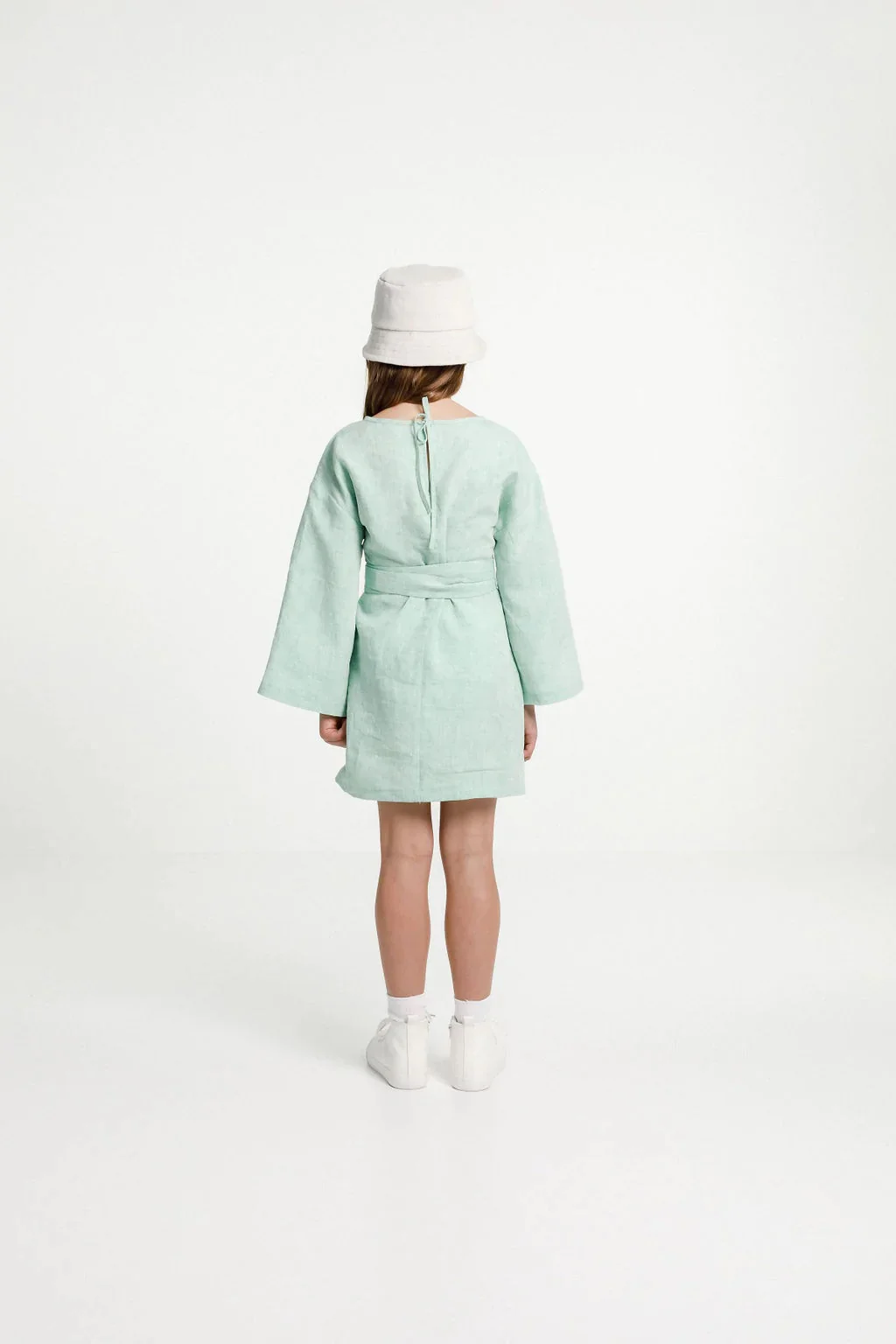 Buy the Child/Teen Array Top and Dress sewing pattern from PaperCute by Papercut Patterns. This wardrobe essential offers three variations to choose from: a dress, top or jumper. Choose between a puffy bell sleeve with an elasticated hem, or a wide flared sleeve. Make your dress with the straight-cut body, or add the extra-long wrap-around ties to cinch it in at the waist. There is a slit and tie closure at the back neckline. You have the same options for the top, but you can also add an elasticated hem to turn your Array into a cute jumper.