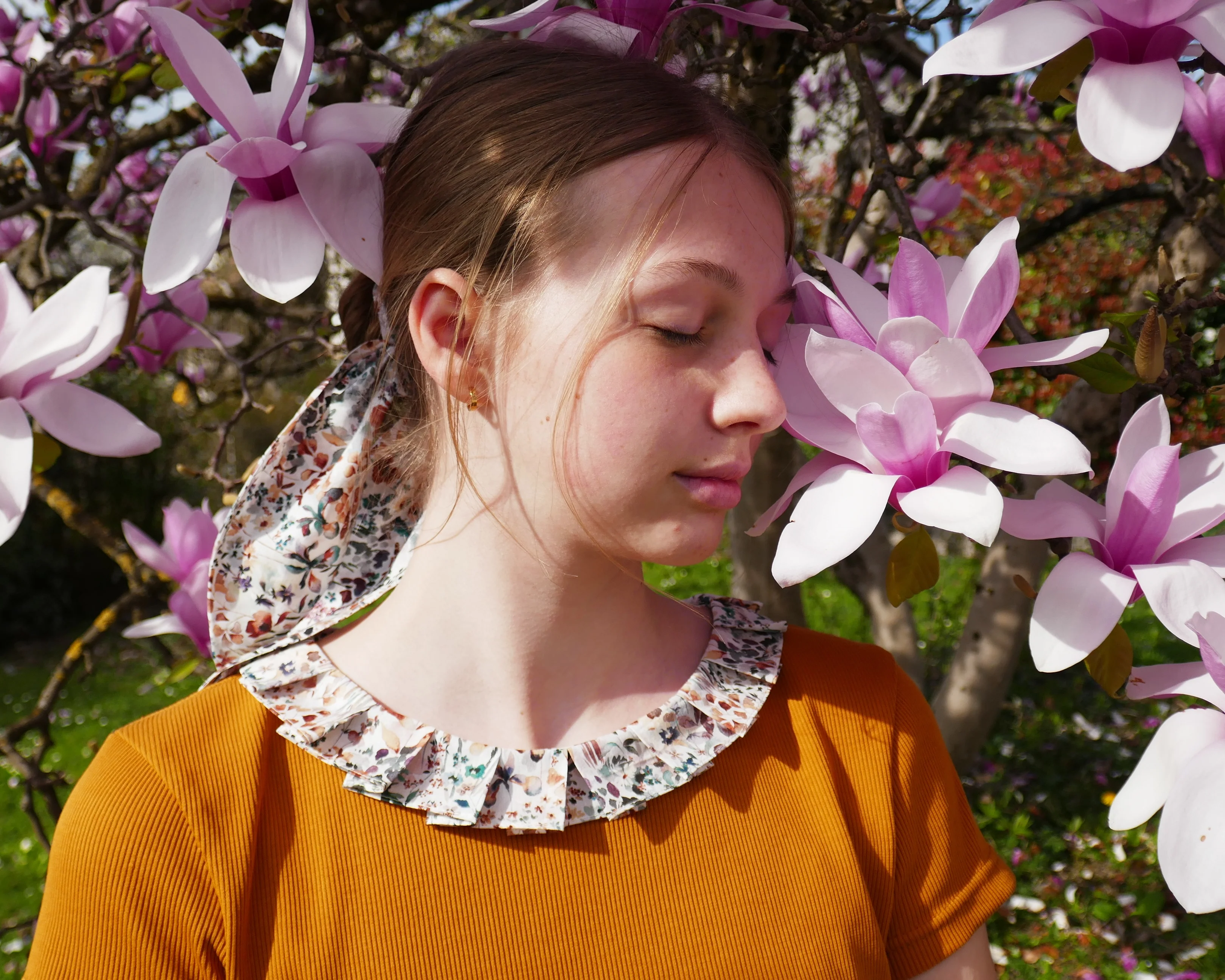 Suggested fabrics: The shirt is designed for a knit fabric with elastane and at least 70% stretch. The collar is designed for a thin woven fabric: Liberty, batiste, cotton voile…